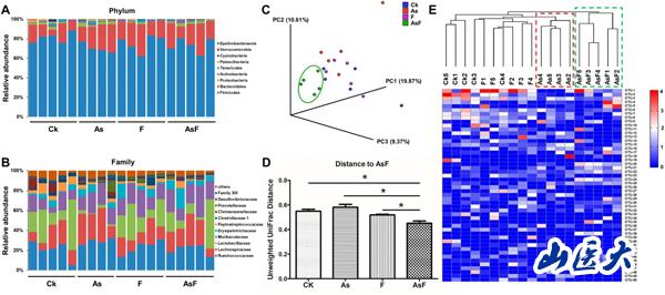 另一方面,該團(tuán)隊首次評估了砷氟暴露對子代大鼠腸道菌群的影響。采用高通量16sRNA測序發(fā)現(xiàn),各暴露組子代大鼠腸道菌群的組成與對照組相比均發(fā)生了顯著變化,且聯(lián)合暴露組菌群變化最為明顯。