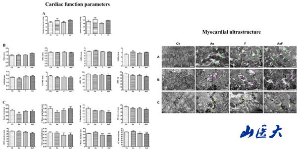 為更深入的了解其發(fā)病機(jī)制,該團(tuán)隊建立了CVEs動物模型展開研究。一方面,評估了砷氟暴露對子代大鼠CVEs的影響。研究發(fā)現(xiàn),砷氟聯(lián)合暴露組大鼠左室射血分?jǐn)?shù)(LVEF)和左室短軸縮短率(LVFS)顯著降低,且P波持續(xù)時間、PR間期、T波持續(xù)時間和QT間期明顯縮短。此外,砷氟暴露可導(dǎo)致子代大鼠心肌纖維排列紊亂,灶性溶解;線粒體體積腫脹,嵴突減少;閏盤部分?jǐn)嗔?,間隙增寬;病理改變在聯(lián)合暴露組最為顯著。