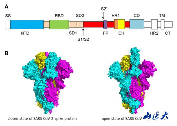 (SARS-CoV-2刺突蛋白的一級結構以及低溫電鏡結構示意圖)