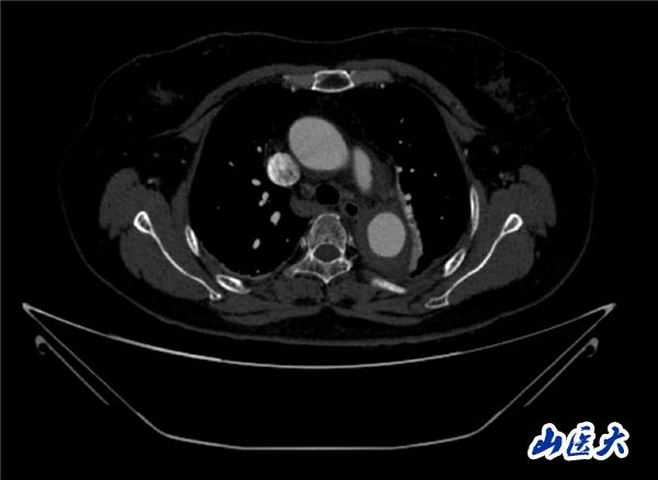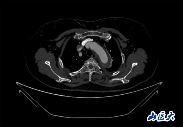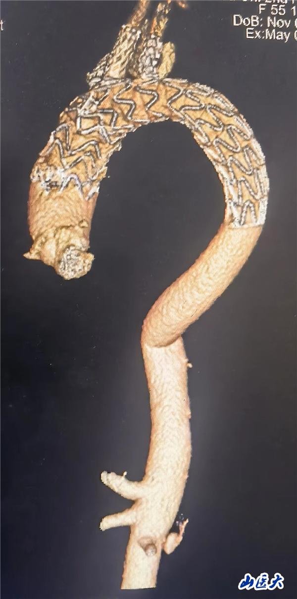 首例患者是一位55歲的女性,她患有高血壓約2年時(shí)間,平時(shí)也會(huì)規(guī)律服用多種降壓藥,但血壓控制始終不盡人意。2023年4月下午,她出現(xiàn)不明原因的頭痛,在家拔罐緩解少許便未到醫(yī)院就醫(yī),次日凌晨突感胸悶、胸背疼痛伴有呼吸困難等癥狀、家人急忙撥打了120,把患者送入醫(yī)院急診科進(jìn)行救治,醫(yī)生在急診科行胸腹主動(dòng)脈CTA時(shí),顯示主動(dòng)脈弓部-降主動(dòng)脈及腹主動(dòng)脈壁間血腫,遂收治入醫(yī)院血管外科,患者入院10天后復(fù)查血腫仍未有改善,依然伴有胸背部疼痛等不適,如不進(jìn)一步處理,可能發(fā)展為夾層危及生命,患者及家屬經(jīng)過(guò)與醫(yī)生團(tuán)隊(duì)了解溝通,決定進(jìn)行創(chuàng)傷小、恢復(fù)快的介入手術(shù)治療。張瑋教授、符偉國(guó)教授、董紅霖教授及其血管外科團(tuán)隊(duì)(閆盛、常文凱、田琴琴)共同商討手術(shù)方案,最終確定使用Zipper?一體式主動(dòng)脈弓覆膜支架系統(tǒng),行胸主動(dòng)脈覆膜支架腔內(nèi)隔絕術(shù)+無(wú)名動(dòng)脈、左頸總動(dòng)脈、左鎖骨下動(dòng)脈分支重建術(shù)為患者進(jìn)行治療。董紅霖教授及其血管外科團(tuán)隊(duì)根據(jù)患者術(shù)前頭顱CT平掃提示雙側(cè)側(cè)腦室旁缺血灶,血壓控制不穩(wěn)定,屬夾層壁間血腫非典型夾層等風(fēng)險(xiǎn)點(diǎn),制定了完整的手術(shù)方案,術(shù)中經(jīng)股動(dòng)脈置入Zipper支架主體,經(jīng)預(yù)留導(dǎo)絲超選無(wú)名動(dòng)脈,并確保主體支架對(duì)位準(zhǔn)確,順利置入左頸總動(dòng)脈、左鎖骨下動(dòng)脈支架,重建弓上三分支。手術(shù)過(guò)程非常順利。術(shù)后觀察主動(dòng)脈及分支覆膜支架定位準(zhǔn)確;無(wú)內(nèi)漏;分支支架通暢,動(dòng)脈供血正常。