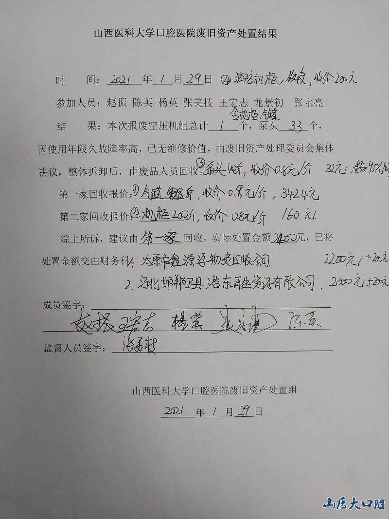 以上兩項固定資產的報廢請示已于2021年1月28日提交院長會議決議通過,并于1月29日由醫院廢舊資產管理委員會全體成員組織兩家社會回收廢舊品單位進行了現場拍賣處置,共拍得現金2400元,已由財務科收訖。