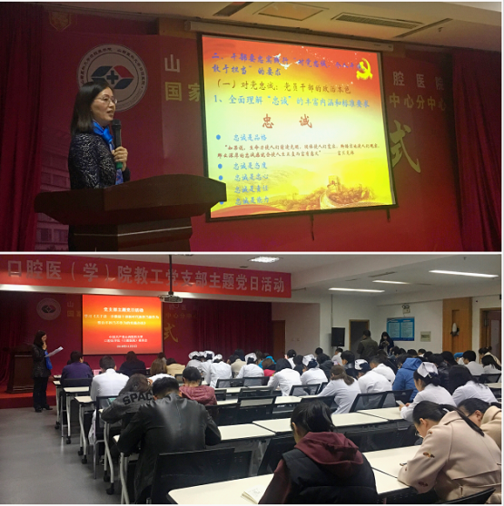 接著,任秀云書記為大家解讀了習近平總書記“對黨忠誠、個人干凈、敢于擔當”十二字“好干部”標準。12字標準是對20字標準的高度概括,并詳細解釋了“忠誠”、“干凈”、“擔當”的豐富內涵和標準要求。她要求全院職工“心存敬畏,守住底線”、“慎獨慎微,管住自己”、“勤于自省,能于自控”。結合我院10.20-11.20為期一個月的醫療服務中開展私收費、少收費、漏收費專項整治工作,醫院專項整治工作組對我院三個涉及外加工的臨床科室--修復科、正畸科、種植科進行了隱患檢查和票據抽查,對三個醫技科室--影像科、檢驗科、藥房進行了專項檢查。目前為止,尚未發現私收費問題。下一步請全院職工加強監督,勇于揭發問題,在全院扎實開展不擔當不作為突出問題的排查及整治工作。