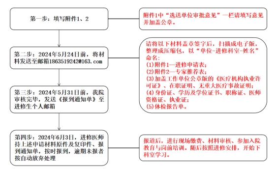 1.我院將對申請表進行審核,審核通過后將會以電話的形式進行通知,請保持電話暢通。已接到通知入科的進修人員,請攜帶相關申請材料,按時報到,逾期者取消當期進修資格。
