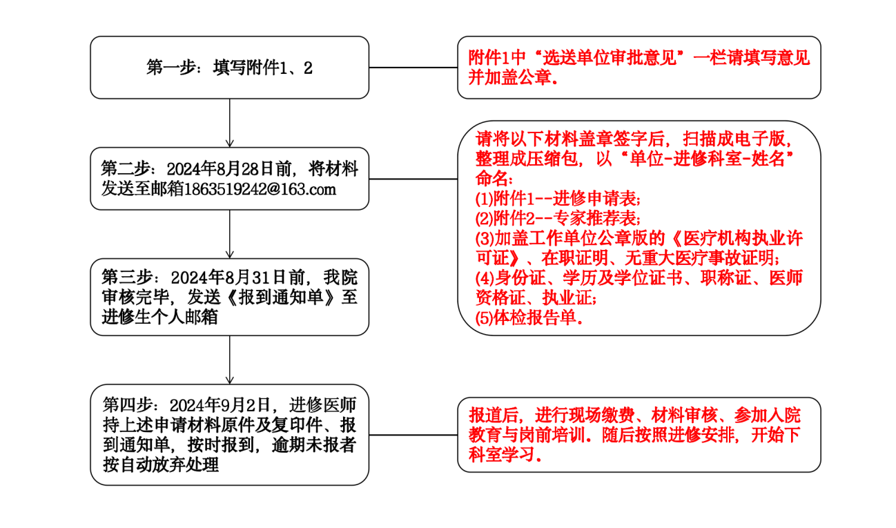 1.我院將對(duì)申請(qǐng)表進(jìn)行審核,審核通過后將會(huì)以電話的形式進(jìn)行通知,請(qǐng)保持電話暢通。已接到通知入科的進(jìn)修人員,請(qǐng)攜帶相關(guān)申請(qǐng)材料,按時(shí)報(bào)到,逾期者取消當(dāng)期進(jìn)修資格。