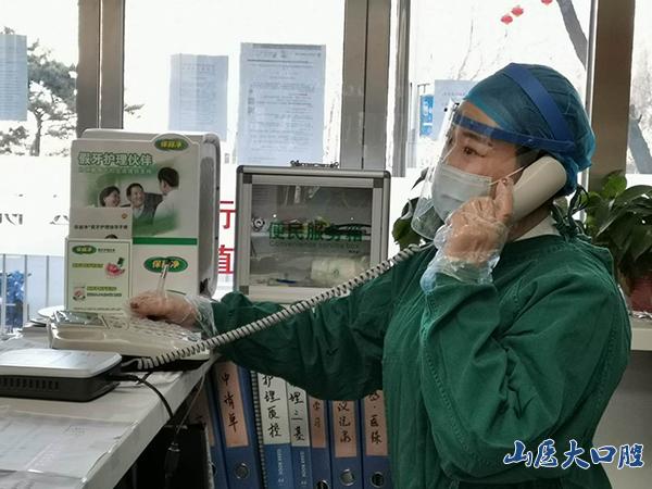 嚴(yán)陣以待是態(tài)度、嚴(yán)管嚴(yán)控是行動。目前,新型冠狀病毒感染肺炎疫情形勢依然嚴(yán)峻,我院按照省衛(wèi)健委要求,全面暫停門診常規(guī)診療工作,只保留必要的口腔急診和咨詢服務(wù)。對于非急性患者的口腔問題,我院采取線上和線下相結(jié)合的方式來滿足患者需求。因此,護(hù)理部選派經(jīng)驗豐富的護(hù)士在醫(yī)院導(dǎo)診總臺接聽咨詢和服務(wù)電話,為患者排憂解難。
