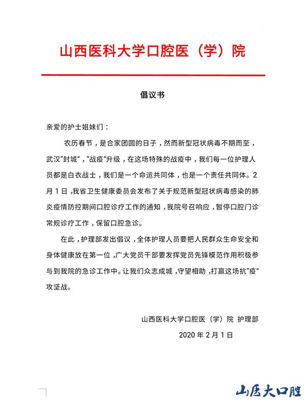 在實際工作中,王君同志深知當先鋒、作表率的重要性,深明抗“疫”任務的嚴峻性,在明知疫情形式不夠明朗的情況下,仍然主動請纓配合葛學軍副院長外出社區給老人治療,無畏危險,是團隊的旗幟!上行下效,2月1日我院緊急下發戰“疫”倡議書,全員護理人員主動請纓投身防控疫情第一線,希望與國家與武漢與我院共度難關。同舟共濟,共赴危難,這就是團隊的魅力!