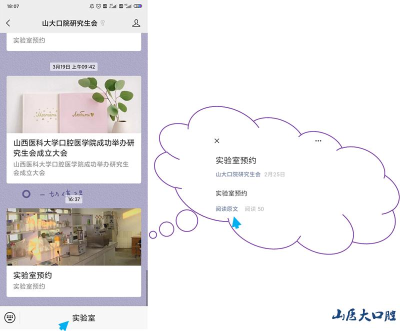 進入“山大口院研究生會”公眾號,點擊“實驗室預約”后“閱讀全文”,進入實驗室線上預約系統。