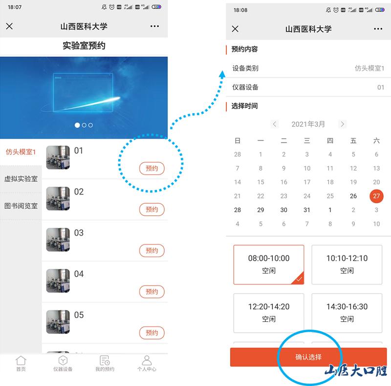選擇“仿頭模室”(或“虛擬實驗室”或“圖書閱覽室”),點擊相應椅位,進入“預約界面”,選擇日期無誤后,點擊“確認選擇”。