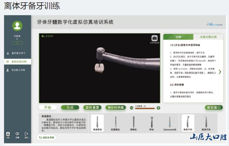 口腔數字化虛擬仿真培訓系統主要用于口腔基礎教學、手術技能訓練、手術操作考核。技能訓練參照口腔執業醫師考試模式,學生可在離體牙模型上練習操作。虛擬系統內所含的教學評估?,可實現實驗操作全過數據記錄和智能量化考核,利于學生及時發現操作過程中的不足,促進自我提高和對技能的掌握。