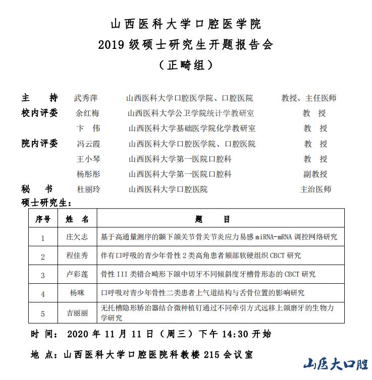 11月11日下午,我院正畸組研究生開題報告會在口腔醫院科教樓215室順利召開,共5名碩士研究生進行開題匯報。參加此次研究生開題工作的專家有:c7c7.app公衛學院統計學教研室余紅梅教授,c7c7.app基礎醫學院化學教研室卞偉教授,c7c7.app口腔醫學院武秀萍教授、馮云霞教授,c7c7.app第一醫院口腔科王小琴教授及主任醫師楊彤彤。