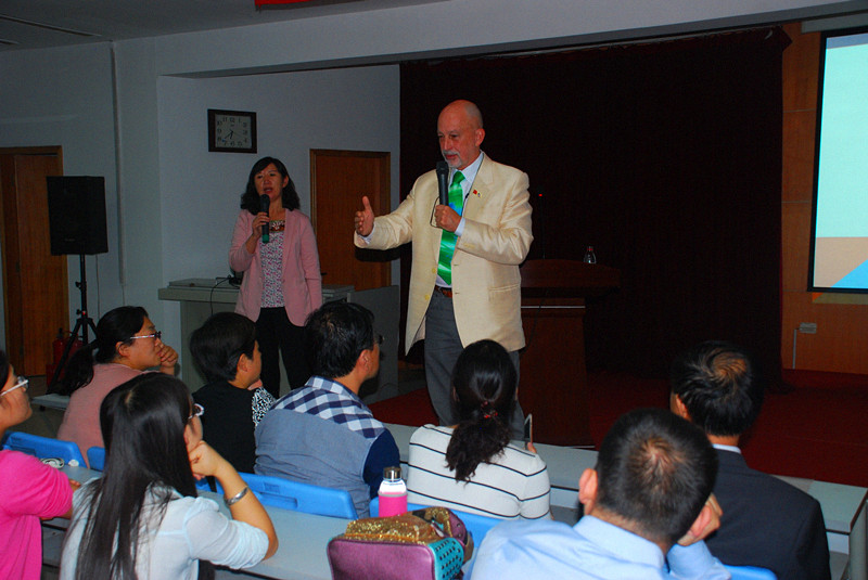 艾瑞克?沙培諾博士從事牙科專業30多年,具有豐富的臨床實踐經驗和教學指導經驗。雖然語言不通,但在翻譯的幫助下,沙培諾博士還是結合自己多年的實踐工作經驗從牙科學、老年醫學、健康管理、臨終關懷、老年人風險因素評估、心理學、溝通學、公共衛生及醫院行政管理等方面,深入淺出地講解了醫患關系中,交流與溝通的重要性。沙培諾博士以自己特有的魅力,感染了每一位到場的聽眾,他的講解飽含激情,在講課過程中時不時走到聽眾中,與聽眾交流互動,從前排到后排,從左排到右排,他充滿活力的身影穿梭在眾多的聽眾中,每一次的交流、對視、握手和擁抱無一不詮釋了溝通的意義和重要性。期間,沙培諾博士仿佛一個魔術師,從口袋里拿出不同的禮物與大家分享。他成功的帶動了現場每一位聽眾的情緒,他的詼諧幽默使得掌聲與歡笑聲在會場里此起彼伏的響起。