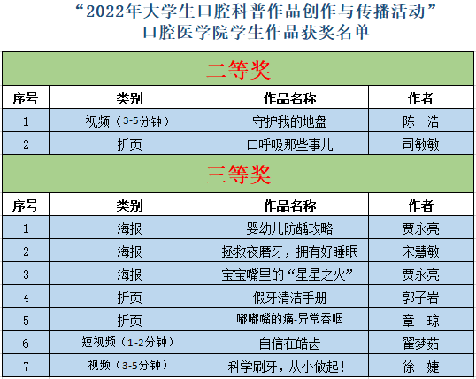8月31日,中華口腔醫學會公布2022年大學生口腔科普作品創作與傳播活動作品入選名單,我院榮獲二等獎2項,三等獎7項。