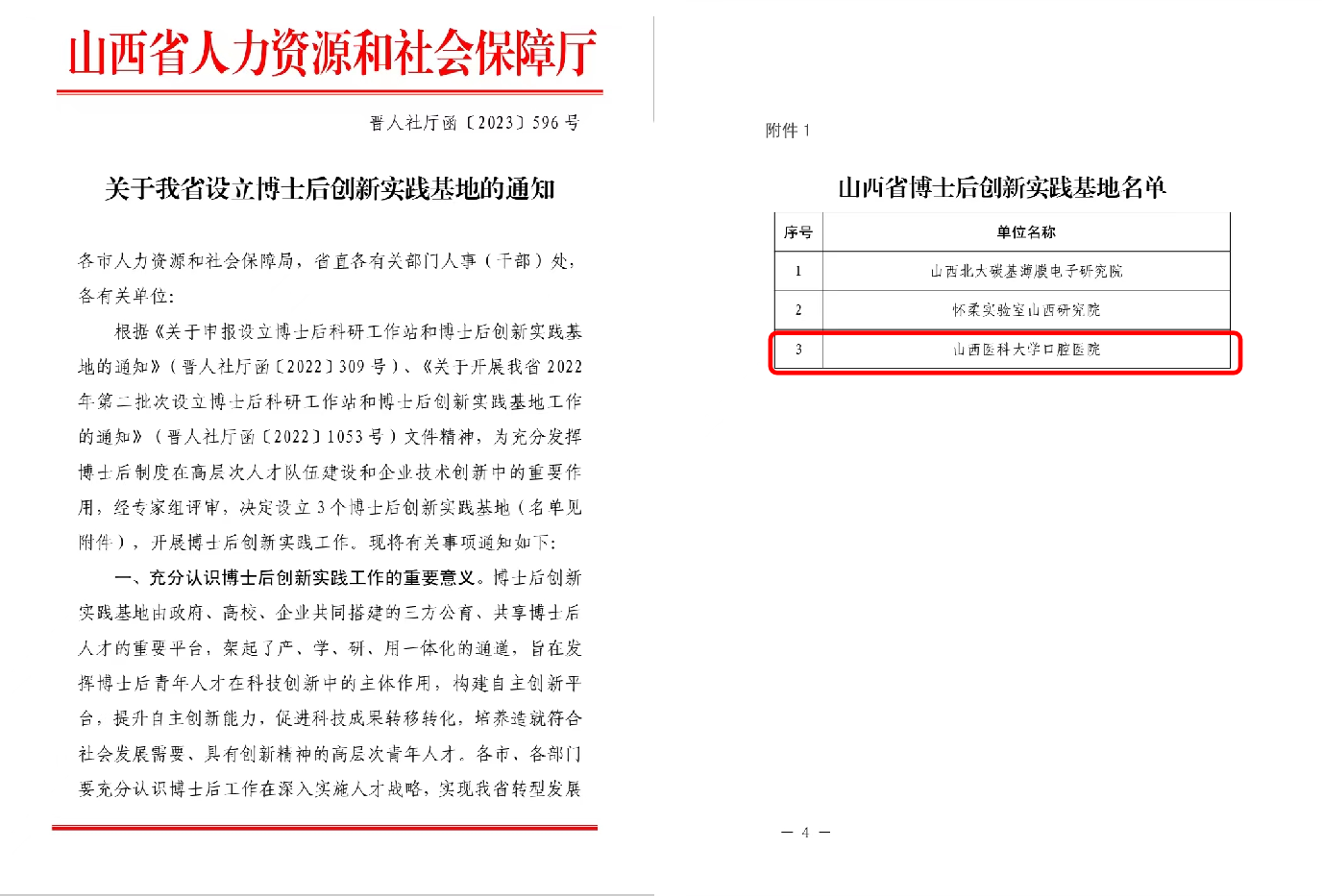 2023年7月25日,山西省人力資源和社會保障廳公布了3家山西省博士后創新實踐基地名單,c7c7.app口腔醫院名列其中,這也是山西省唯一一個口腔醫學的博士后創新實踐基地。
