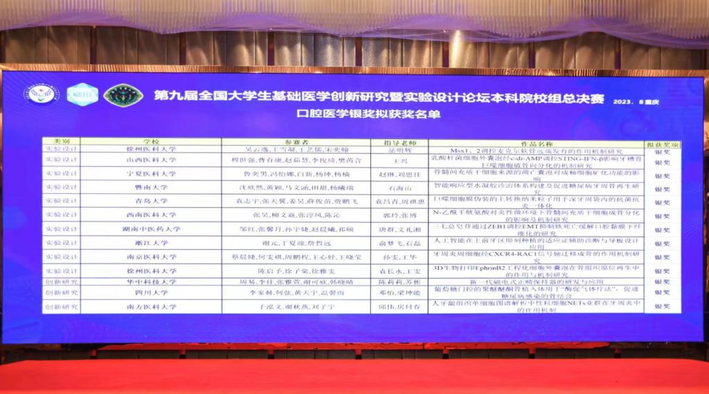 第九屆全國大學生基礎醫學創新研究暨實驗設計論壇決賽于2023年8月25日在陸軍軍醫大學拉開帷幕,34個本科生團隊展開角逐,經過激烈競爭后,我院王興教授指導參賽團隊完成的項目《乳酸桿菌細胞外囊泡經 c-di-AMP 調控 STING-IFN-β影響牙槽骨巨噬細胞破骨向分化的機制研究》榮獲銀獎。