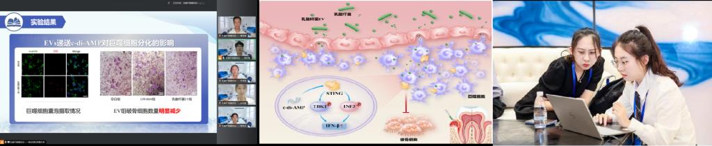我院參賽作品《乳酸桿菌細胞外囊泡經c-di-AMP 調控 STING-IFN-β影響牙槽骨巨噬細胞破骨向分化的機制研究》項目創新性地探討了一種針對牙周炎導致的牙槽骨吸收的新型治療方式:乳酸桿菌釋放的細胞外囊泡內含環二腺苷酸可跨物種激活人巨噬細胞表面干擾素基因刺激因子從而調控巨噬細胞破骨向分化治療其導致的牙槽骨吸收,同時避免乳酸桿菌的產酸致齲作用。團隊成員從牙周炎導致的牙槽骨吸收入手,并深入探究其發生發展機制,提出了乳酸桿菌囊泡抑制牙槽骨吸收的治療途徑,實驗設計中,團隊成員依托于重點實驗室和臨床研究中心,熟練掌握了相關實驗途徑與實驗方法,具有理論與人員安排可行性。在實驗完善實施方面,團隊成員多學科交叉互補,專創融合,層層深入,交叉驗證為牙周炎牙槽骨吸收的臨床治療拓展新的視角。