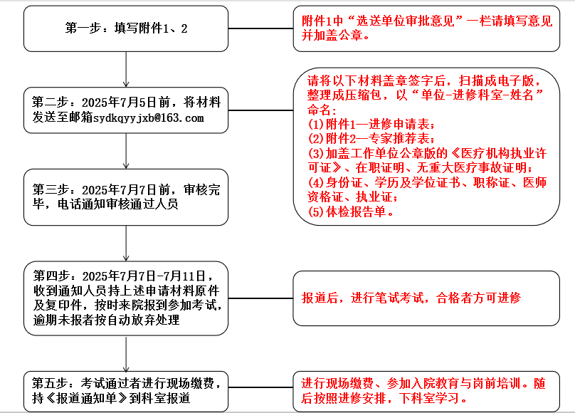 1.我院將對申請表進行審核,審核通過后將會以電話的形式進行通知,請保持電話暢通。接到通知的人員,請攜帶相關申請材料,按指定時間來院報到參加考試,合格者方可進修。