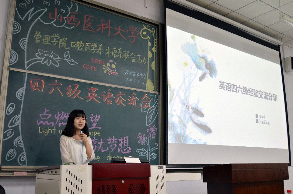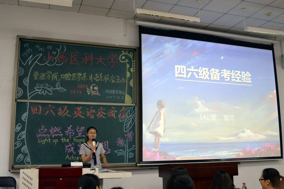 為了迎接即將到來的英語四六級考試,激勵同學們更好地學習英語,6月2日,口腔醫學系、外語系、管理學院在新校區慎思樓B101教室聯合舉辦“點燃希望,成就夢想”四六級英語交流會。管理學院分團委喬曉梅書記和口腔醫學系分團委張楠書記及口腔醫學系、外語系和管理學院學生參加了活動。