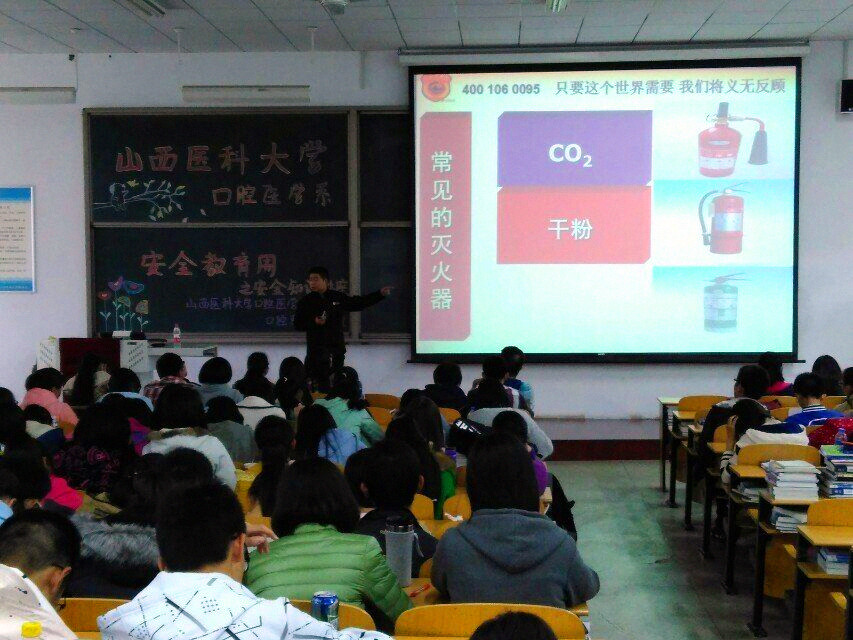 安全講座活動中,口腔醫學系邀請到了2015年公益傳播使者山西天龍救援隊總教練陳俊東對新校區全體口腔醫學生進行消防安全知識培訓。在整個講座中,陳教練運用多媒體幻燈片為大家進行生動形象的講解,同時結合真實火災情況的統計數據和火災現場的拍攝照片,讓大家感受到了火災的頻發及危險。結合大學校園消防安全隱患,陳教練著重講解了用電類火災情況、消防器材的正確使用和自救方法等。通過講解,使同學們深刻的認識到做好防火安全措施,不僅是對自己的生命負責,更是對他人的負責!