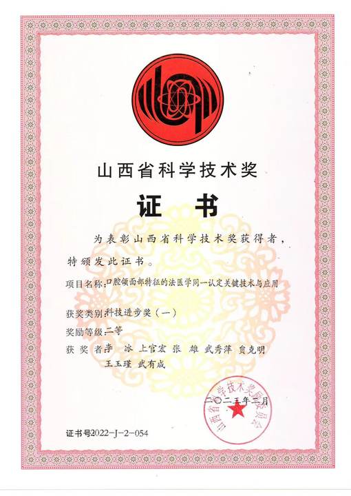 近日,山西省人民政府發布了《關于2022年度山西省科學技術獎勵的決定》(晉政函〔2023〕13號),對促進我省科學技術進步和經濟社會發展作出突出貢獻的科學技術人員和組織給予獎勵,我院李冰教授團隊申報的“口腔頜面部特征的法醫學同一認定關鍵技術與應用”項目喜獲山西省科技進步獎二等獎。