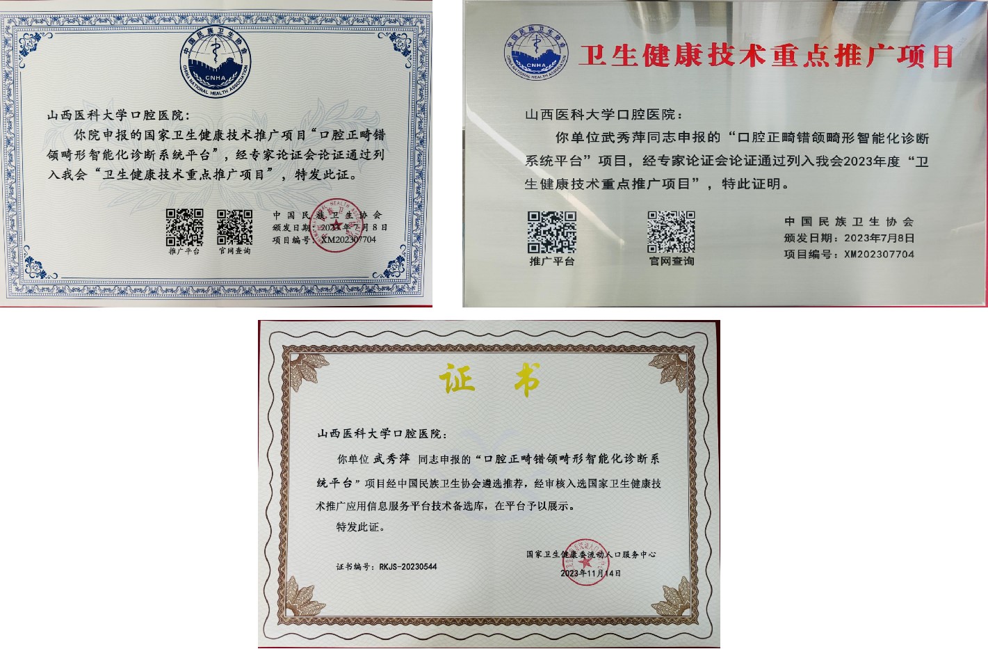 我院正畸科武秀萍教授主持申報(bào)的“口腔正畸錯(cuò)頜畸形智能化診斷系統(tǒng)平臺(tái)”國(guó)家衛(wèi)生健康技術(shù)推廣項(xiàng)目,于2023年7月列入中國(guó)民族衛(wèi)生協(xié)會(huì)“衛(wèi)生健康技術(shù)重點(diǎn)推廣項(xiàng)目”,同年11月入選國(guó)家衛(wèi)生健康技術(shù)推廣應(yīng)用信息服務(wù)平臺(tái)技術(shù)備選庫(kù),并在平臺(tái)予以展示。