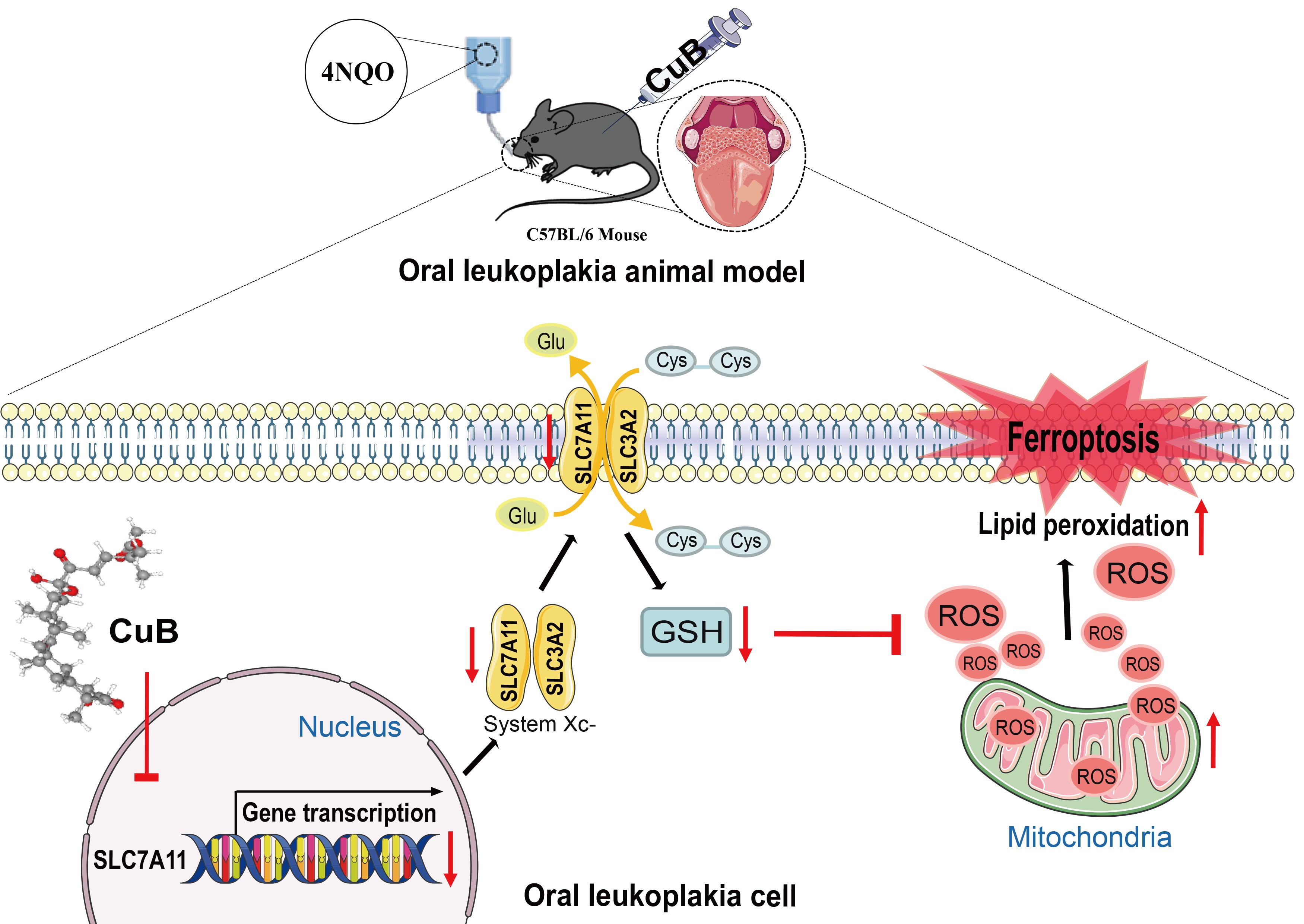 張芳教授團隊通過體外實驗證明了CuB可能通過下調SLC7A11的表達從而激活鐵死亡的發生,具體表現為升高ROS、MDA、Fe2+,下調GSH。體內實驗證明,CuB通過激活SLC7A11/線粒體氧化應激通路誘導鐵死亡,有效抑制OLK的惡性進展,為CuB未來用于OLK臨床藥物的開發提供理論基礎和科學依據。