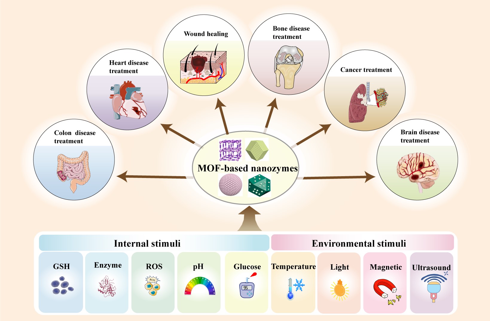 納米酶是一種具有仿酶活性的納米材料,因其穩(wěn)定性、可調(diào)性和成本效益而在生物醫(yī)學(xué)領(lǐng)域備受關(guān)注。其中,基于金屬有機(jī)框架(Metal-Organic Framework,MOF)的納米酶因其獨(dú)特的結(jié)構(gòu)和可定制的特性脫穎而出。文章首先全面介紹了基于MOF的納米酶的分類,這些納米酶旨在模仿氧化酶、過(guò)氧化物酶、過(guò)氧化氫酶、超氧化物歧化酶、水解酶和多功能酶的催化功能,深入研究了基于MOF的納米酶對(duì)特定刺激的反應(yīng),以確保在環(huán)境變化中提高催化性能的特異性和有效性。此外,該論文還介紹了MOF基納米酶在癌癥治療、組織再生等生物醫(yī)學(xué)方面取得的研究進(jìn)展,并深入探討了該前沿領(lǐng)域的未來(lái)機(jī)遇和挑戰(zhàn)。這些基于刺激響應(yīng)MOF的納米酶為先進(jìn)的治療策略提供了新的途徑,為創(chuàng)新的生物醫(yī)學(xué)應(yīng)用提供了前景。