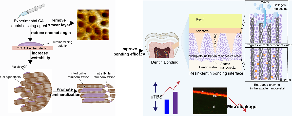 樹脂復合材料因其良好的美觀性和優異的即刻牙本質粘接強度而被廣泛應用于牙科修復。然而,牙本質粘接耐久度有限仍舊是亟需被克服的難題。作為一種很有前途的解決方案,引導組織再礦化可以誘導磷灰石納米晶體的形成,修復牙本質粘接界面中的缺陷。在這項研究中作者提出了一種可去除玷污層的實驗型檸檬酸(Citric Acid, CA)牙科酸蝕劑。牙齒經CA酸蝕后,約殘留有3.55wt %CA緊密吸附在膠原纖維上,降低了再礦化液與牙本質間的界面能。在膠原纖維層面,CA預處理有助于在礦化 24 小時后實現完全的纖維內和纖維外礦化。在牙本質層面,CA顯著促進了聚酰胺-胺誘導的牙本質仿生礦化,再礦化牙本質的彈性模量和顯微硬度能夠恢復到健康牙本質的水平。CA通過界面控制產生的再礦化混合層中微滲漏明顯減少,并提供了比傳統磷酸酸蝕更牢固、更持久的粘接效果,因此CA具有一定的臨床意義。