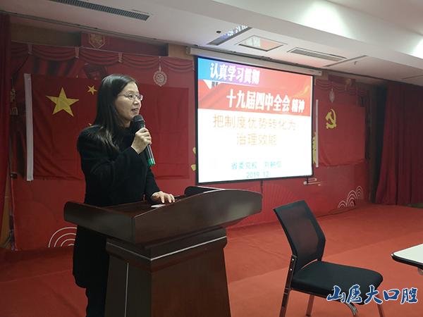 劉教授首先從“社會治安權(quán)的‘外包’、國務(wù)院公布環(huán)保熱線、政府購買公共服務(wù)”等五個生動典型的案例,展開了對行政管理體制改革、政府提升社會治理能力的分析與思考。接著,分析了提出“堅持和完善中國特色社會主義制度、推進國家治理體系和治理能力現(xiàn)代化”的歷史背景和原因。隨后,從結(jié)構(gòu)和內(nèi)容上詳細(xì)論述了十九屆四中全會審議通過的《中共中央關(guān)于堅持和完善中國特色社會主義制度、推進國家治理體系和治理能力現(xiàn)代化若干重大問題的決定》。劉教授將5000余字的全會公報歸納總結(jié)為1個重要判斷、3項重要結(jié)論、13個優(yōu)勢、3步目標(biāo)、10個新等內(nèi)容。最后分析探討了堅持和完善中國特色社會主義制度、推進國家治理體系和治理能力現(xiàn)代化的形成過程及貢獻推進全球治理的中國智慧與方案。他多次引用了毛澤東“喚起工農(nóng)千百萬,同心干”的詩詞,強調(diào)了在國際局勢的風(fēng)云變幻、中國發(fā)展面臨內(nèi)憂外患的情況下,要打贏防范化解重大風(fēng)險攻堅戰(zhàn),必須堅持和完善中國特色社會主義制度、推進國家治理體系和治理能力現(xiàn)代化,運用制度威力應(yīng)對風(fēng)險挑戰(zhàn),這充分激勵了全體黨員干部的愛國主義熱情和“為中華民族謀復(fù)興”的使命感。最后,任秀云書記和劉教授帶領(lǐng)大家對公報中的內(nèi)容做了互動問答,再次強調(diào)了建設(shè)人人有責(zé)、人人盡責(zé)、人人享有的社會治理共同體的重要意義。全體黨員干部積極參與、踴躍搶答,充分展現(xiàn)了我院黨員干部良好的政治理論素養(yǎng)。