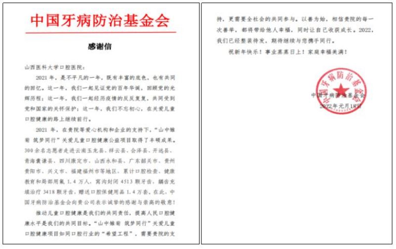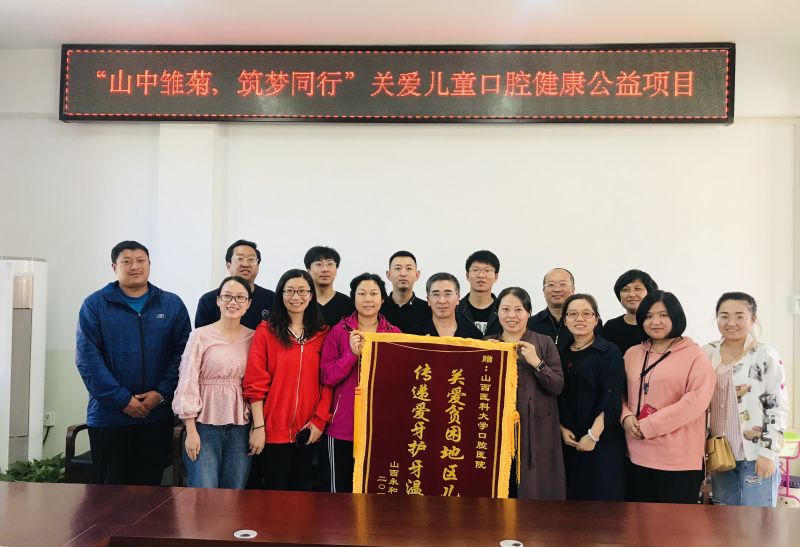 2019年及2021年“9·20全國愛牙日”期間,由國家衛生健康委國際交流與合作中心、中國牙病防治基金會共同發起的“山中雛菊 筑夢同行”關愛兒童口腔健康公益項目在國家級貧困縣——山西省臨汾市永和縣共開展兩次活動。我院派出的醫護團隊在活動中,以團結、高效、嚴謹、認真的工作態度得到了國家專家、永和縣政府部門、受幫扶學校領導及學生家長的一致好評,作為對我院工作的高度認可和表彰,中國牙病防治基金會為我院頒發一封感謝信,當地政府部門授予一面錦旗。