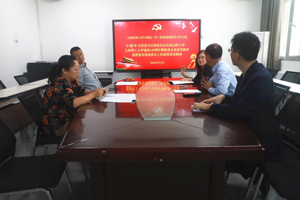 9月13日上午,口腔醫(學)院黨委理論學習中心組在科教樓215會議室召開擴大會議,專題學習省委書記林武在慶祝山西大學、太原理工大學建校120周年暨推進全省高等教育高質量發展座談會上的講話精神。院領導班子成員參加會議,院黨委書記任秀云主持會議。