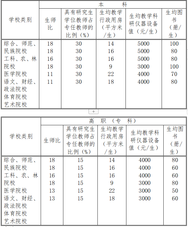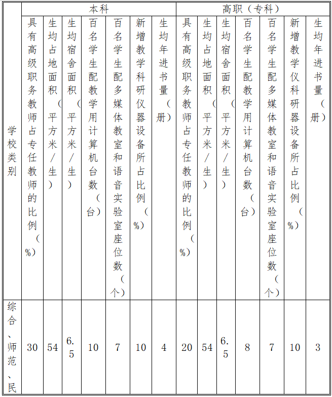 ⒉凡生師比指標不高于表中數值,且其它指標不低于表中數值的學校為合格學校。
