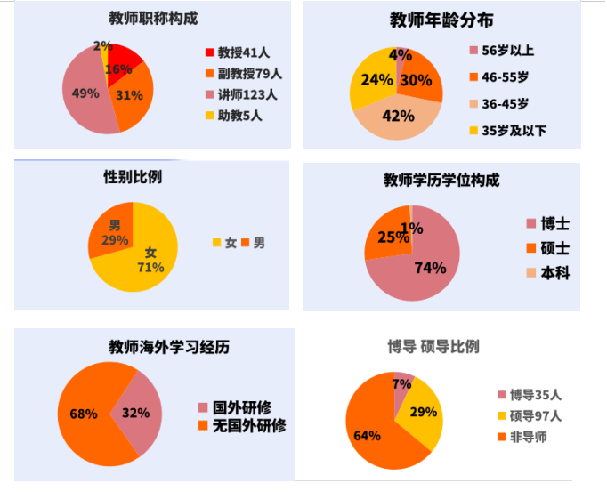 截至目前教職工298人,其中教師251人,教輔 43 人,管理人員 10 人;教授 41 人,副教授 79 人;博士生導師 21人,碩士生導師 83 人。