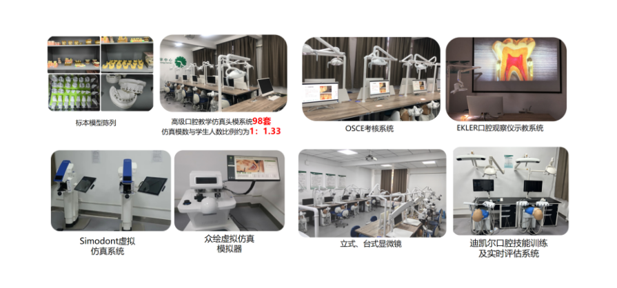 口腔綜合實驗室是山西省本科實驗教學示范中心,設口腔基礎實驗教學中心和口腔臨床技能實訓中心。口腔基礎實驗室占地880平方米,口腔臨床技能實訓中心占地650平方米,承擔全部口腔醫學專業實驗課程,擁有教學設備及器械4000余件,儀器設備總價值約1722萬元。擁有口腔教學仿真頭模系統98套,擁有OSCE考核系統、臺式、立式顯微鏡,設有虛擬仿真實驗室。