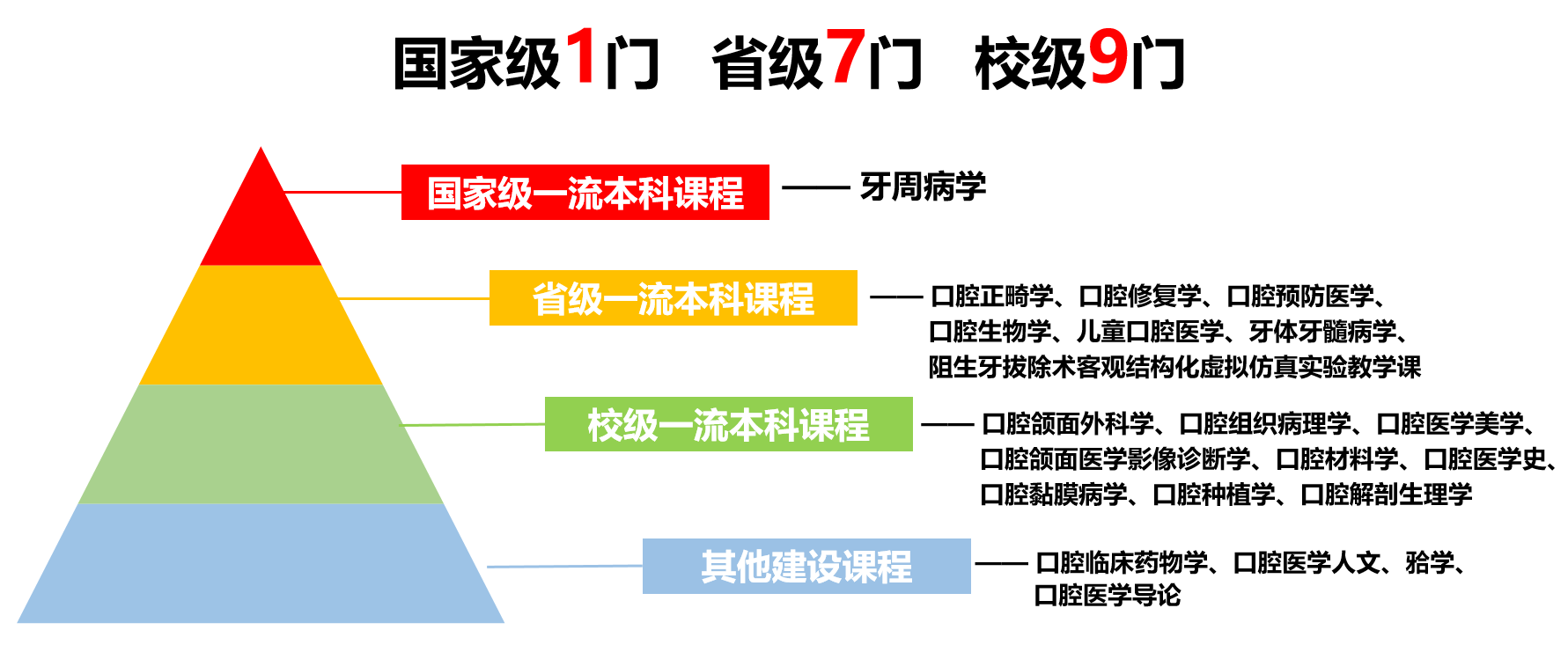 一流本科課程建設成效顯著:通過系列日常教學活動、培訓及比賽等持續建設,學院《牙周病學》獲批2023年度國家級線上線下混合一流本科課程,形成了由1門國家級一流課程領銜,7門省級一流課程助力,9門校級一流課程支撐全面覆蓋口腔醫學專業主干課程的精品課程體系。