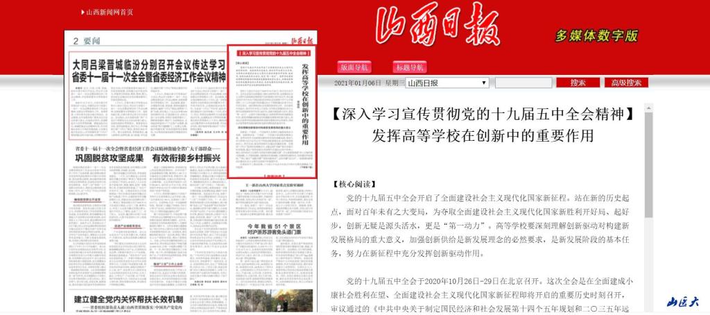 黨的十九屆五中全會開啟了全面建設社會主義現代化國家新征程。站在新的歷史起點,面對百年未有之大變局,為奪取全面建設社會主義現代化國家新勝利開好局、起好步,創新無疑是源頭活水,更是“第一動力”。1月5日,校黨委副書記賀培鳳教授在《山西日報》要聞版刊發署名文章《發揮高等學校在創新中的重要作用》。文章認為,高等學校要深刻理解創新驅動對構建新發展格局的重大意義,加強創新供給是新發展理念的必然要求,是新發展階段的基本任務,努力在新征程中充分發揮創新驅動作用。