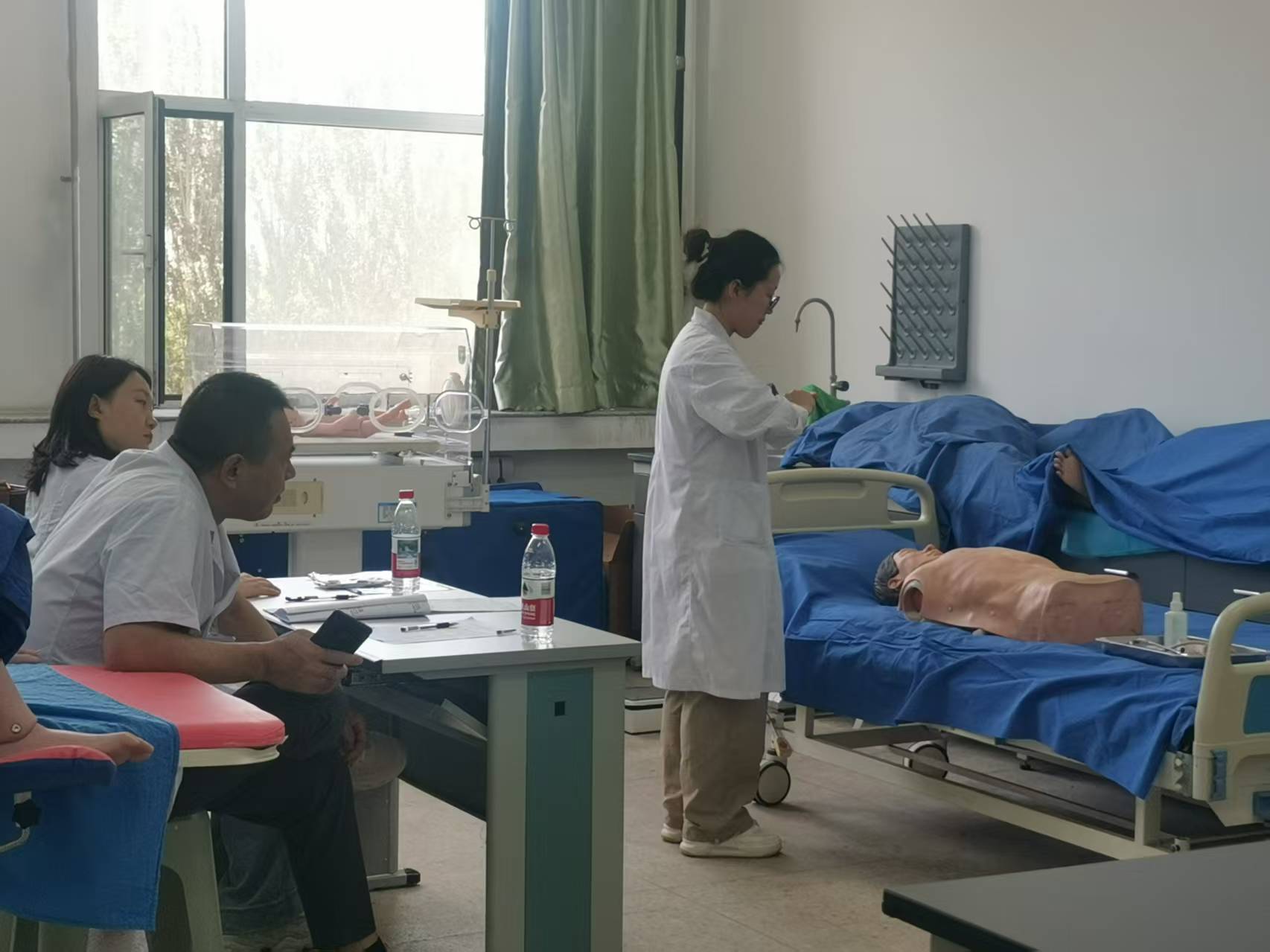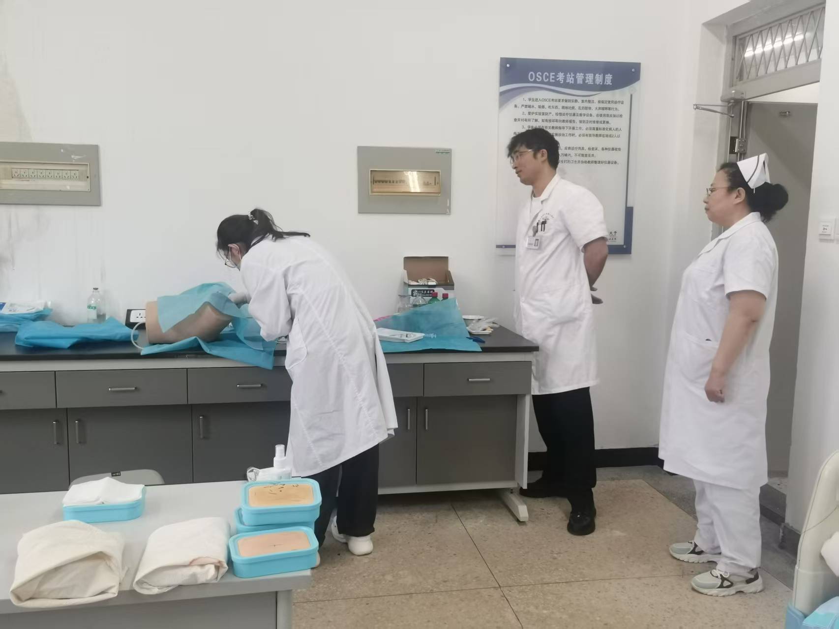 在臨床基本能力訓練板塊,我院精心設置 14 組核心技能項目,涵蓋穿脫手術衣、換藥與拆線、靜脈穿刺等基本操作,以及心肺聽診、腹部觸診等體格檢查內容。訓練采用 "精講 + 精準練習" 模式:每組技能由第一、第二臨床醫院的專業教師精講 2 學時,隨后學生以 5 人小組為單位開展實操練習,教師全程在場指導糾錯,確保每一項操作規范嚴謹。
