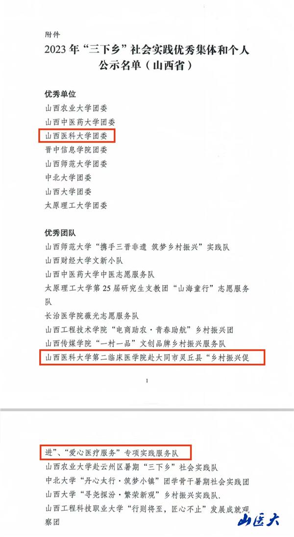 近日,為做好典型宣傳、激勵廣泛參與、發揮育人實效,團中央組織開展了2023年全國暑期“三下鄉”社會實踐活動總結工作,經充分研究、嚴格把關,結合活動開展的實效和日常工作了解情況,對表現突出的集體和個人進行了通報表揚,我校團委入選2023年全國暑期“三下鄉”社會實踐優秀單位,第二臨床醫學院赴大同市靈丘縣專項實踐服務隊入選優秀團隊。