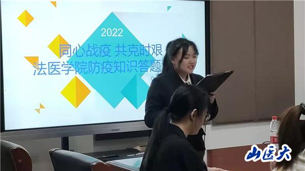 在防疫知識問答競賽中,競賽問題以新冠肺炎常識性問題、山西省防疫政策及學校防疫政策為主要內容,全面、系統得考察了學生的防疫知識儲備。2019、2020級兩支代表隊伍憑借充足的常識貯存和機敏的反應速度接連按響搶答鈴,給出了準確無誤的答案。整場競賽節奏輕快、笑聲不斷,給場下同學帶來了良好的觀眾體驗。最后,孫俊紅宣布了本場比賽兩隊得分及獲勝隊伍為2019級代表隊,以三分優勢在比賽中勝出。