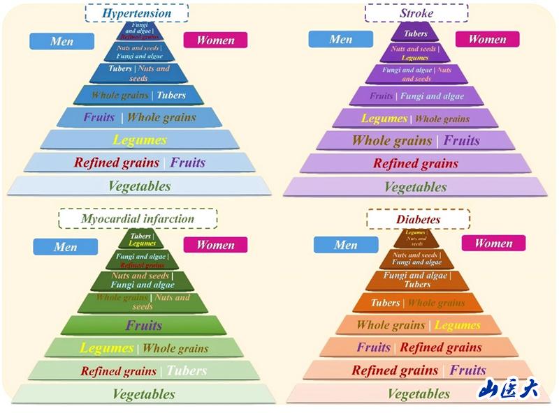 慢性病,特別是心血管疾病和糖尿病,構成了全球健康的重大負擔,且飲食因素對這些慢性病的發生與發展有重要影響。以往研究表明,地中海飲食以及植物性飲食(如水果、蔬菜、堅果和全谷物)可顯著降低心血管疾病的發病風險。盡管植物性飲食的健康益處已被廣泛認可,現有縱向研究中關于飲食與慢性病發病風險的時不變和線性關聯假設,可能導致對二者關系的估計偏差。此外,多病共存和性別差異往往被忽視,這限制了飲食建議的個體化和全面性。本研究利用中國健康與營養調查數據,結合縱向研究中時變混雜控制的方法,評估植物性食物攝入與四種慢性。ǜ哐埂⒛宰渲、心梗、糖尿。┓⒉》縵罩淶某て諂驕亮-反應關系及其性別差異,構建了與慢性病預防相關的植物性食物飲食金字塔(圖一),發現不論男性女性,食用富含蔬菜、全谷物、水果、真菌和藻類的飲食可同時降低四種慢性病的患病風險;而男性可以適度地攝入精制谷物;女性應增加堅果和種子的攝入量,以降低慢性疾病的發病風險。該研究結論為制定更精準的慢性病預防策略提供依據。