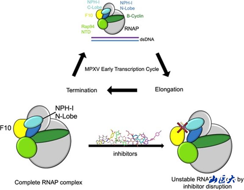 圖 1. MPXV F10在RNAP中的作用機制及針對F10篩選MPXV抑制劑的策略