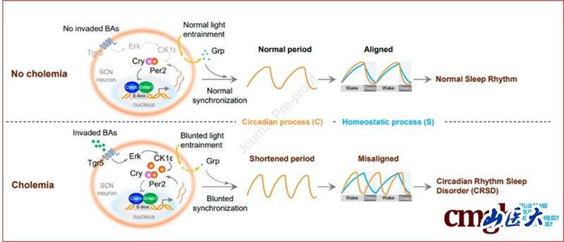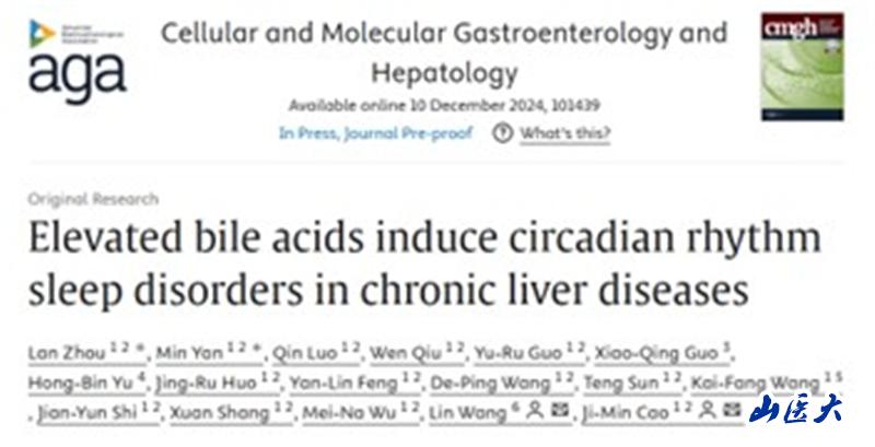 近日,我校細胞生理學教育部重點實驗室曹濟民教授團隊在《Cellular and Molecular Gastroenterology and Hepatology》(中國科學院一區期刊)發表了題為“Elevated bile acids induce circadian rhythm sleep disorders in chronic liver diseases”的研究論文(DOI:10.1016/j.jcmgh.2024.101439),周嵐副教授和博士生閆敏為共同第一作者,曹濟民教授為主通訊作者。