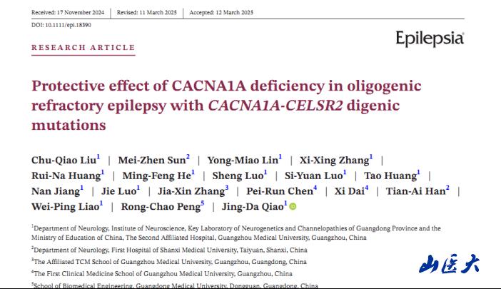 近日,我校第一醫(yī)院神經(jīng)內(nèi)科孫美珍教授與廣東醫(yī)科大學(xué)劉楚翹博士、彭榮超教授和廣州醫(yī)科大學(xué)附屬第二醫(yī)院神經(jīng)內(nèi)科廖衛(wèi)平教授、喬景達(dá)博士合作完成了一項(xiàng)關(guān)于癲癇基因相互作用及其在藥物難治性癲癇的保護(hù)機(jī)理研究。該研究在國(guó)際期刊《Epilepsia》發(fā)表(中國(guó)科學(xué)院1區(qū),影響因子6.6):Protective effect of CACNA1A deficiency in oligogenic refractory epilepsy with CACNA1A-CELSR2 digenic mutations。該研究聚焦一例同時(shí)攜帶CACNA1A和CELSR2兩個(gè)罕見基因變異的藥物難治性癲癇病例,利用果蠅模型構(gòu)建多基因突變模型,結(jié)合邏輯回歸分析,鈣成像技術(shù),藥物和基因治療技術(shù),發(fā)現(xiàn)癲癇致病基因CACNA1A在不同遺傳背景下具有致病/抗癲癇的多重作用,揭示了CACNA1A和CELSR2基因在癲癇發(fā)病中的交互作用,為認(rèn)識(shí)寡基因背景下的藥物難治性癲癇的發(fā)病機(jī)理提供了新思路,為其精準(zhǔn)治療帶來新的治愈希望。