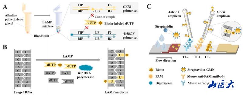 案件現場的生物檢材可提供重要的遺傳學信息以推動案件偵破。然而,由于犯罪嫌疑人對案件現場的破壞,獲取的生物檢材往往是痕量或降解的。因此,需要從痕量樣本中同時鑒定多個靶標以獲取盡可能多的生物學信息。盡管多重環介導等溫擴增結合免疫層析的方法可進行痕量樣本分析,但在多重環介導等溫擴增中,多個靶標共享底物,使得每個靶標的可檢測擴增產物減少,從而導致免疫層析試紙條上的顯色信號較弱。此外,該方法無法防止引物二聚體造成的假陽性結果。