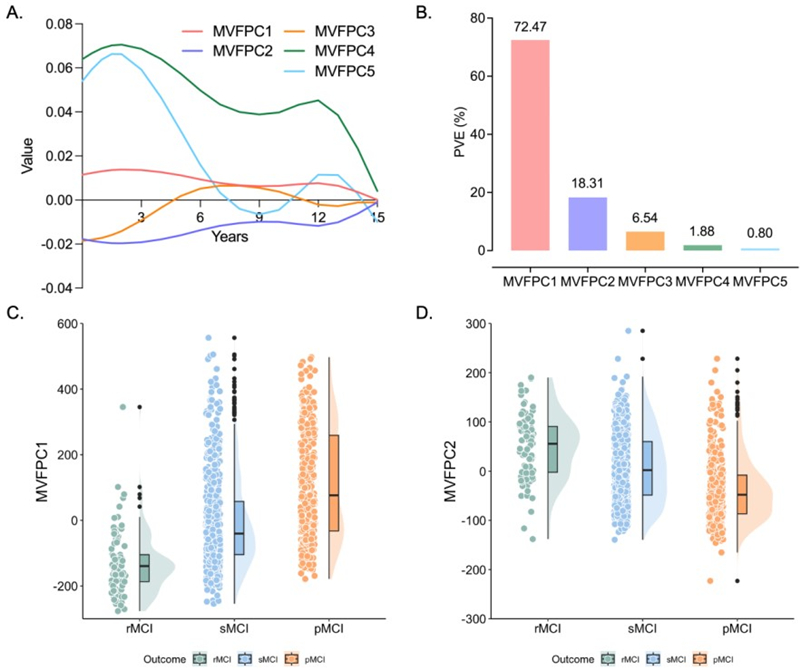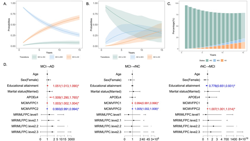 該研究引入雙重研究目標(降維與動態(tài)建模),采用多變量函數(shù)型主成分分析(MVFPCA)捕捉多維度縱向認知的異質(zhì)性模式(圖2),采用多層函數(shù)型主成分分析(MLFPCA)提取灰質(zhì)體積比的時空信息(圖3和圖4);開發(fā)函數(shù)型多狀態(tài)模型,整合上述函數(shù)型縱向標志物,以刻畫MCI初診后不同認知狀態(tài)間的動態(tài)轉(zhuǎn)歸路徑(圖5)。