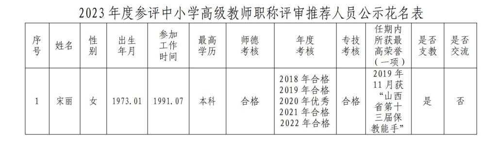 根據國家和省、市深化職稱制度改革精神,按照《太原市教育局 太原市人力資源和社會保障局關于開展2023年度市直屬中小學一級教師和市中小學高級教師職稱評審工作的通知》(并教師〔2023〕3號)安排及我校推薦工作方案,我校職稱評審推薦委員會對我校1名申報人員任現職以來各年度的職業道德、業績能力、出勤情況、學術成果、表彰獎勵等方面進行了全面考評,得出最終考評結果。現將相應排名順序名單公示如下,歡迎全體教職工進行監督。