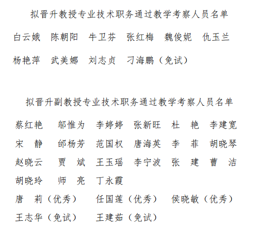 經學校本科教學督導委員會認真負責、辛苦緊張的工作,2018年度擬晉升教學型和教學科研型教師高級專業技術職務人員集中教學考察環節已經結束。綜合平時教學考察成績(占30%)和集中教學考察成績(占70%),現將通過教學考察人員名單(含獲省級及以上教學競賽獎免于教學考察3人)公示如下,公示時間自12月11日至12月13日。如對考察結果有異議,請于公示期內實名向人事處反映。