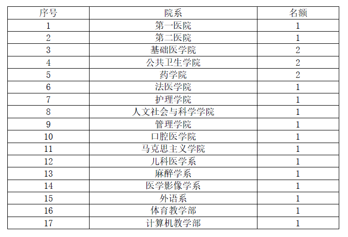 我校共20個培訓名額,各院系培訓名額分配情況見下表。