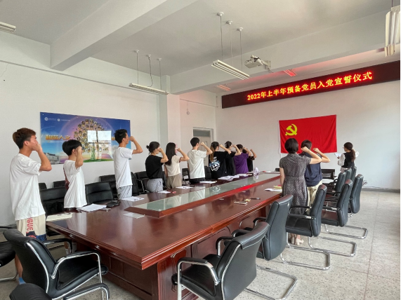 輔導員張燕首先宣讀上半年新發展黨員名單。接下來,在學生黨支部書記楊卿同志的帶領下,全體黨員舉起右拳,在鮮紅的黨旗下莊嚴宣誓。