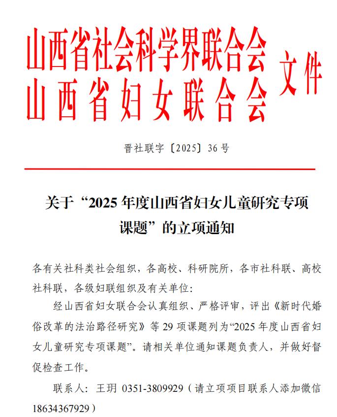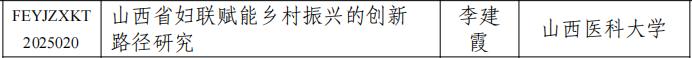 近日,“2025年度山西省婦女兒童研究專項課題”項目立項名單公布,我校李建霞教師申報的項目《山西省婦聯(lián)賦能鄉(xiāng)村振興的創(chuàng)新路徑研究》獲批立項。