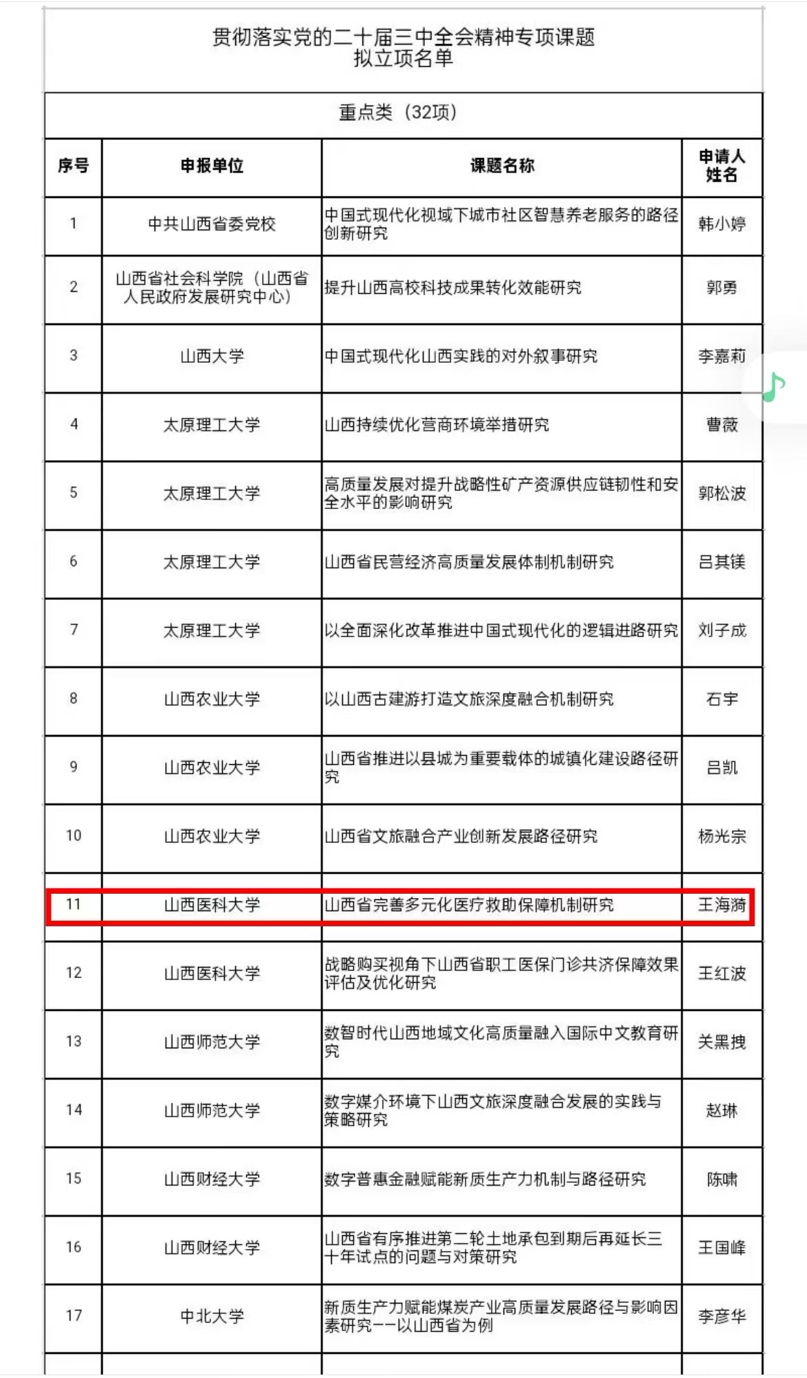 近日,山西省哲學(xué)社會(huì)科學(xué)規(guī)劃辦公室公布了2024年度“貫徹落實(shí)黨的二十屆三中全會(huì)精神”專項(xiàng)課題立項(xiàng)名單。我院教師王海漪申報(bào)的課題成功獲批重點(diǎn)項(xiàng)目立項(xiàng)。